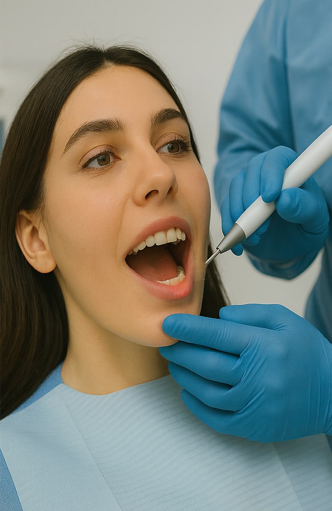 - التقييم الشامل: فحص لثة/عظم + صور بانوراما وCBCT.