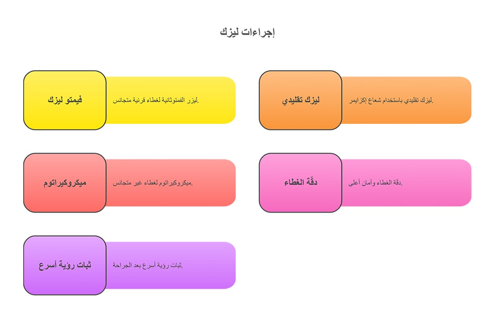- تصحيح النظر بالليزر يشمل ليزك، فيمتو ليزك، سمايل، و PRK—تُختار التقنية بعد فحوص دقيقة.